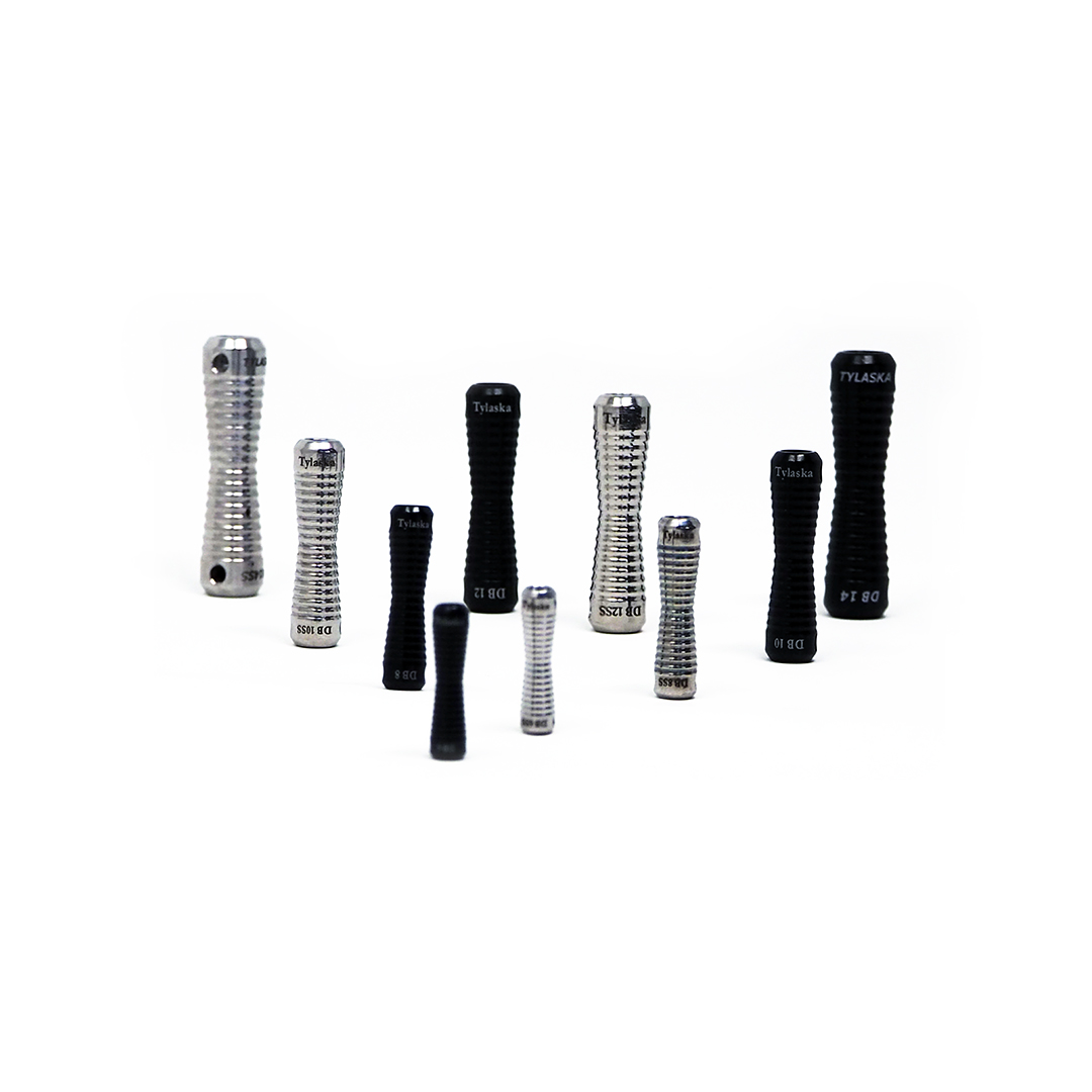 As the dogbone relies on friction to keep the connecting line from slipping off its ends, designs with straight shanks are not very secure and adding flanges to the shank creates snagging problems. Tapering the shank is better, but still does not grip the line. The new Tylaska design has both a taper and multiple surface humps that grip the line but do not cut or damage the fibers. This feature works extremely well and makes a big difference over competing designs. Dog bones are available in Stainless or black aluminium and there are a variety of sizes to choose from.
